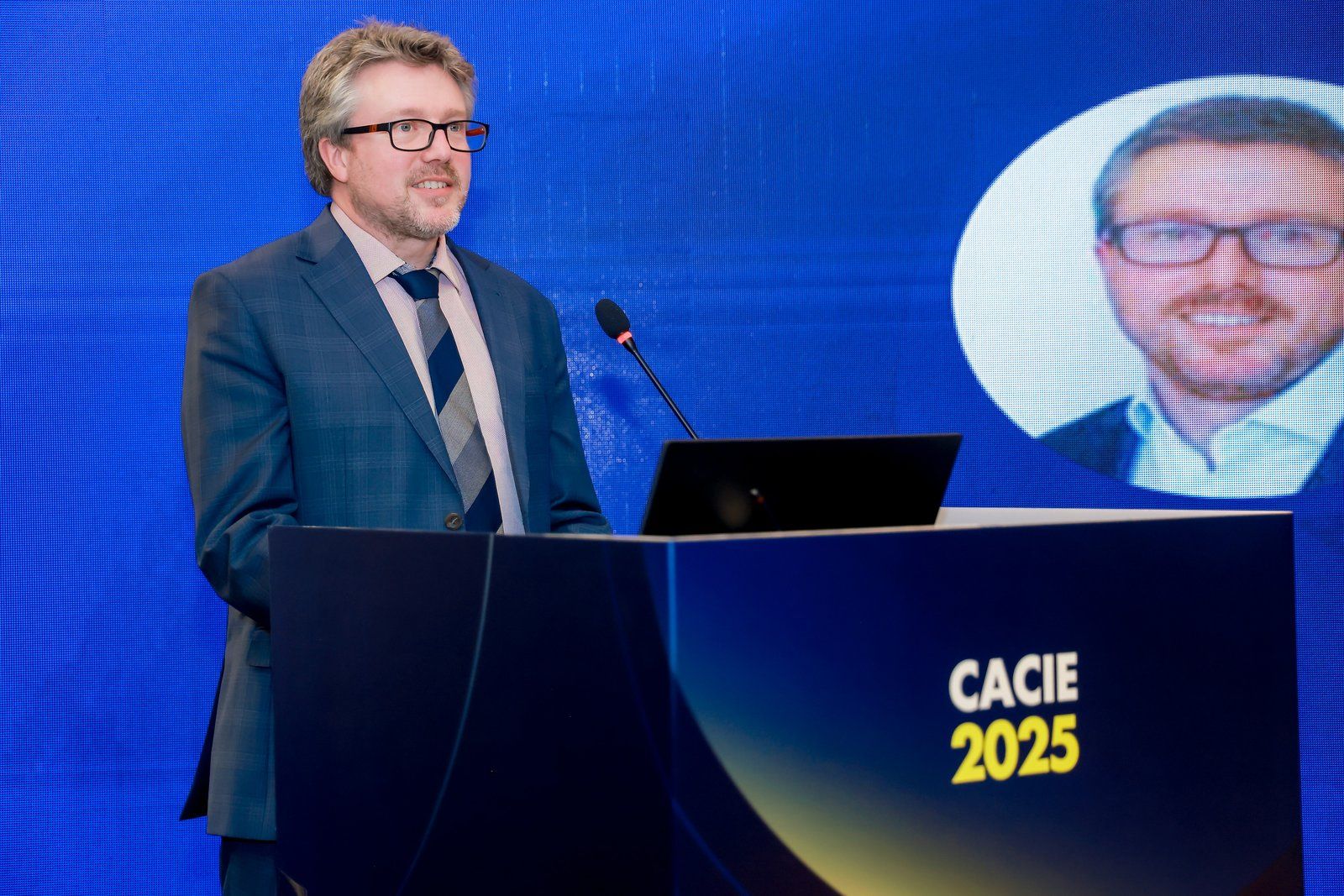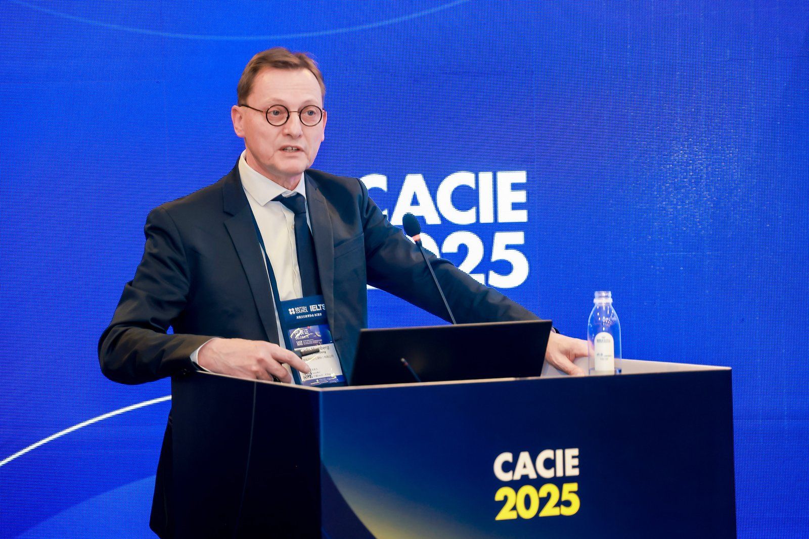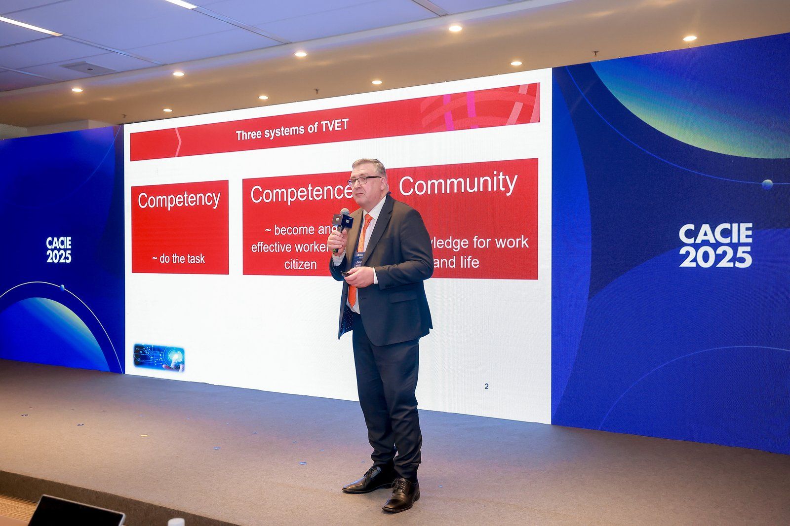 主旨发言阶段由张金刚主持。联合国教科文组织高等教育处高级项目专家刘育锋,德国TÜV莱茵学院全球职业教育总监Carlo Humberg,非洲技术与应用型大学与学院协会秘书长扎哈·法勒,中国常驻联合国教科文组织原大使衔代表杨进,澳大利亚维多利亚州政府技能局首席执行官Craig Robertson等专家聚焦“全球职业技术教育发展的新趋势和新挑战”这一主题,分别以《不确定时代的职业教育发展战略及国际合作》《产教协同赋能职业教育国际化建设》《非洲职业教育转型:趋势、挑战和机遇》《中国职业教育发展和改革的国际意义》《全球职业技术教育与培训的新兴趋势与挑战》为题作主旨发言。张金刚对职业教育国际交流合作的进展与成就表示肯定,提出职业教育作为支撑全球经济转型升级的关键力量,需要打破地域与文化的边界,构建开放包容的合作生态,共同谋划职业教育国际化、数字化与人性化高度融合的未来。