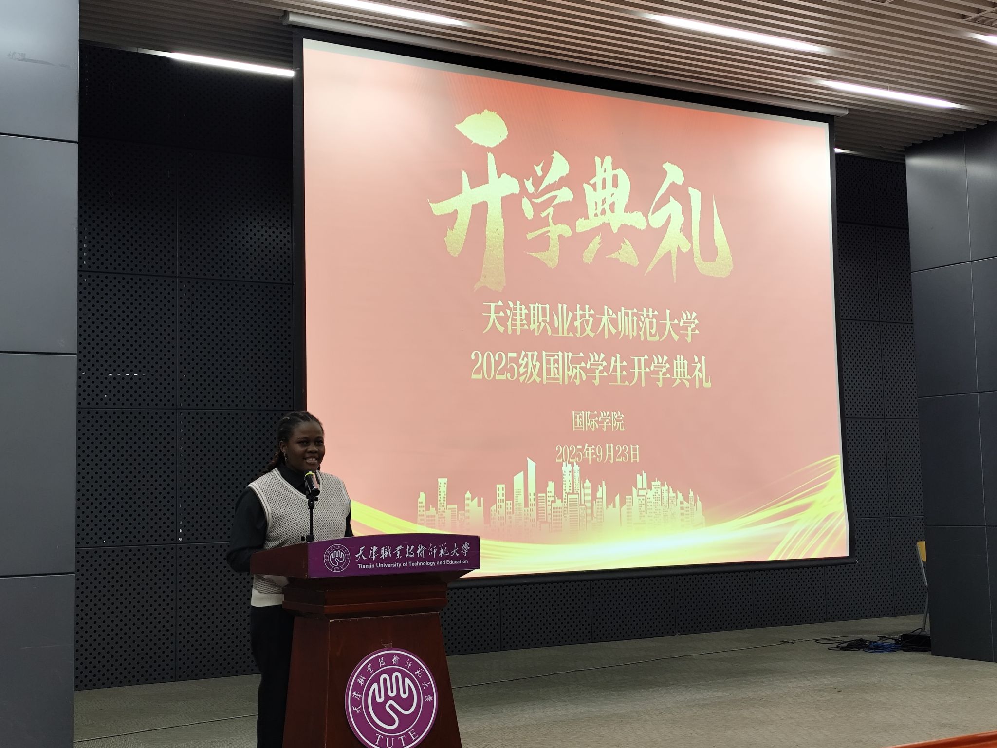 在校生代表、来自赤道几内亚的古马同学分享了自己在校期间的学习与成长经历,鼓励新生勇于尝试、敢于突破,不断超越自我。新生代表、来自尼日利亚的李欣然同学表达了成为“天职师大人”的荣幸与激动,她表示将和所有新生一起珍惜机遇、努力学习、广泛交流,不负时光、成就梦想。